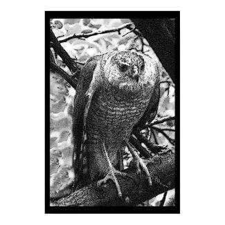A Sharp-Shinned Hawk is perched on a branch very close to my bird feeders in upstate New York. He is hoping to catch a meal. This hawk's prey is mostly small birds. Although the "Sharpie" is the smallest hawk in North America, he is a very fierce predator. As soon as I got the photo, I chased him away! This black and white poster is a digital photograph, enhanced to emphasize the dramatic effect of this hunter's fierce nature.